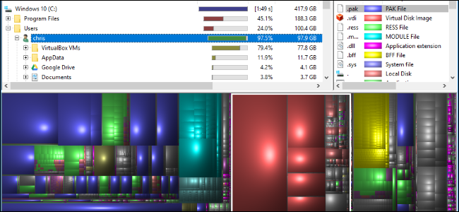 view that shows you a color-coded view of what’s using space. On the right, there’s a file extension list that shows you statistics about which file types are using the most space. It also serves as a legend, explaining the colors that appear in the bottom of the window.