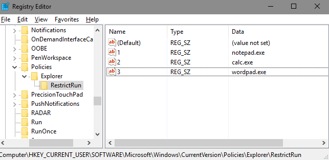 RestrictRun key for each app you want to block. Right-click the RestrictRun value and then choose New > String Value. You’ll be naming these values with simple numbers, so name the first value you create “1.”Double-click the new value to open its property dialog, type the name of the executable you want to block into the “Value data” box (e.g., notepad.exe ), and then click “OK.”