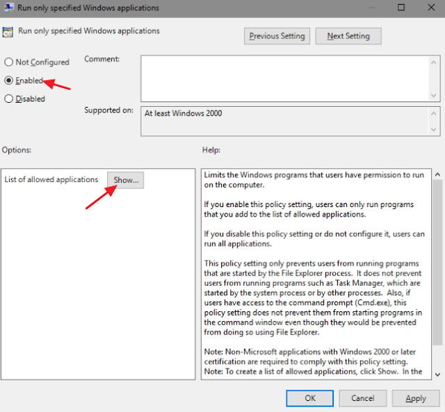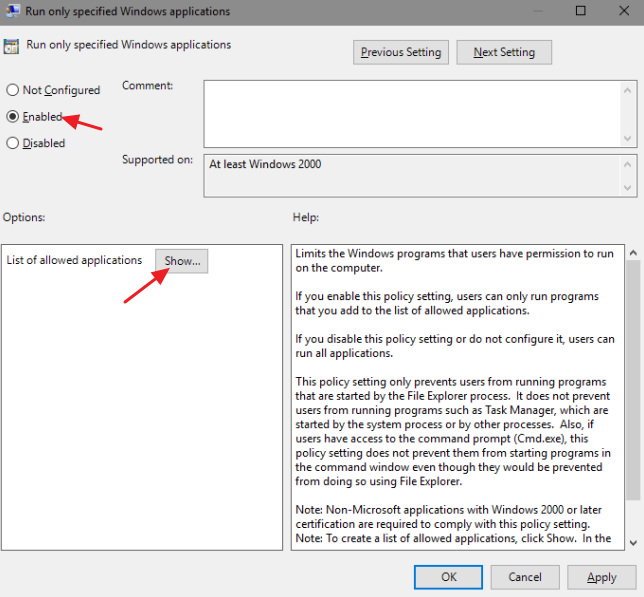 In the properties window that opens, click the “Enabled” option and then click the “Show” button.