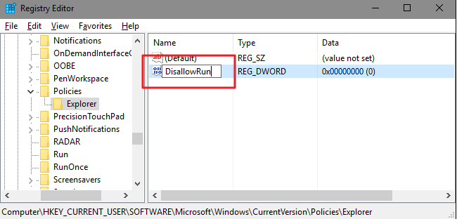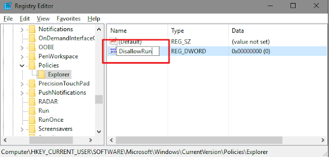 Explorer key. Right-click the Explorer key and choose New > DWORD (32-bit) value. Name the new value DisallowRun .