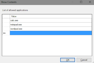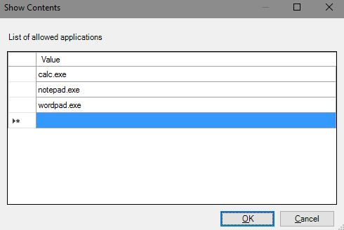 In the “Show Contents” window, click each line in the list and type the name of the excecutable you want users to be able to run (or the name of apps you want to block if that’s what you’re doing instead). When you’re done building your list, click “OK.”