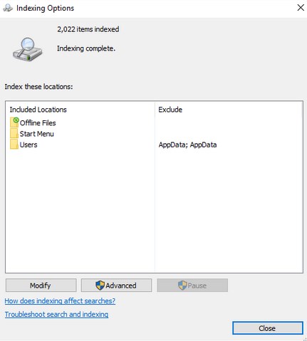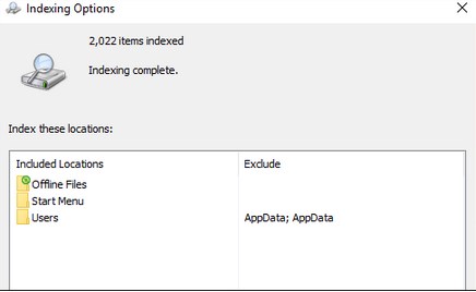 On Windows 10, Windows indexes two particularly important locations by default. It indexes the “Start Menu” folder, so it can find and return application shortcuts. It also indexes your “Users” folders, with the exception of the hidden AppData, or Application Data, folders.