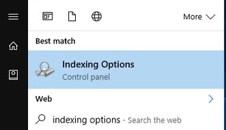You can also just open the Start menu, search for “Indexing Options”, and press “Enter” or click the “Indexing Options” shortcut to launch it.