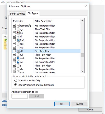 You can also add new files types here and tell Windows you want to index them, if you use another type of file extension that Windows doesn’t normally index.