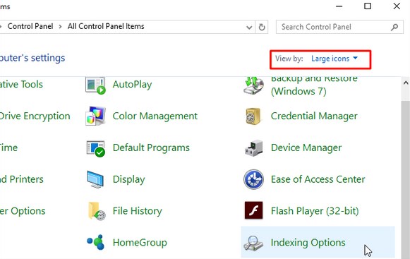 Even more confusingly, this tool is not normally shown in the Control Panel’s default category view. To open it, you have to open the Control Panel, click the “View by” menu, and select either “Large icons” or “Small icons”. You’ll then see an “Indexing Options” shortcut in the list.