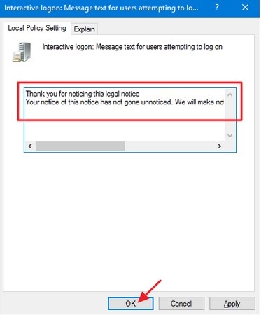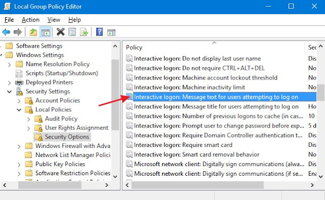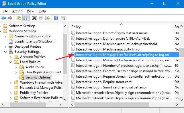Back in the Local Group Policy Editor main window, find the “Interactive logon: Message text for users attempting to log on” setting and double-click it to open its properties window.