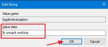 The legalnoticecaption value serves as the title of your message. It appears at the top and in a slightly larger font than the text of the message. Of course, if you only want a very short message, feel free to just use legalnoticecaption and leave legalnoticetext blank. In the “Value data” box, type the title of your message and then click “OK.”