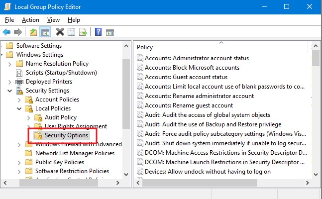In the Local Group Policy Editor, on the left-hand side, drill down to Computer Configuration > Windows Settings > Security Settings > Local Policies > Security Options.