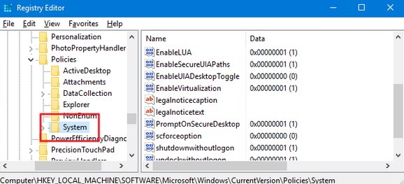 In the Registry Editor, use the left sidebar to navigate to the following key: HKEY_LOCAL_MACHINESoftwareMicrosoftWindowsCurrentVersionPoliciesSystem