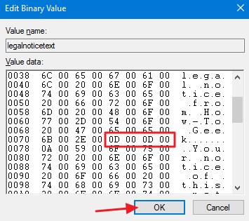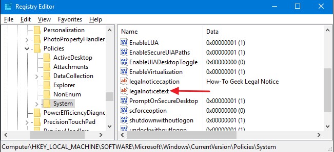 Back in the main Registry Editor window, double-click the legalnoticetext value to open its properties window.