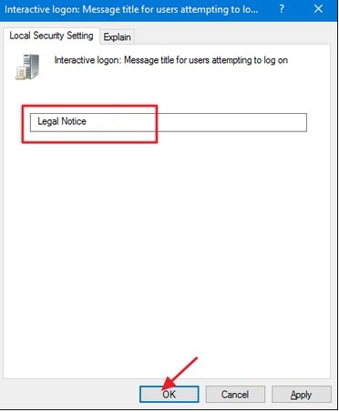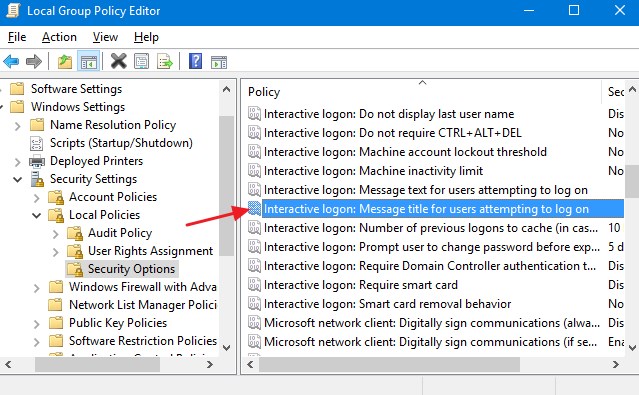 On the right, find the “Interactive logon: Message title for users attempting to log on” setting and double-click it to open its properties window.