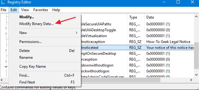 If you want to insert carriage returns into your text, you can do that right in Registry Editor. Select the legalnoticetext value, click the “Edit” menu, and then click “Modify Binary Data.”