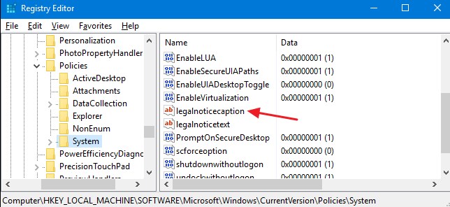 In the right-hand pane, you’ll see two values named legalnoticecaption and legalnoticetext. You’ll be editing both of these to create your message. Double-click the legalnoticecaption value to open its properties window.
