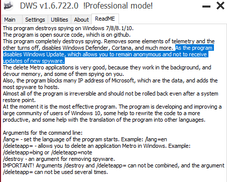 Download DWS and you’ll see it will “disable Windows Update” so you will “not receive updates of new spyware”. The tool also notes that the changes made are “irreversible”, so there’s no easy way to undo them without just reinstalling Windows. That means you won’t get important security updates and stability fixes to problems like the recent webcam breakage, either.