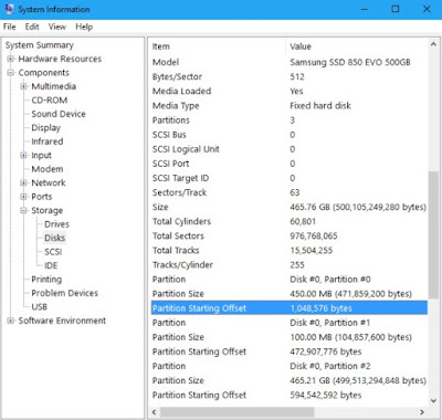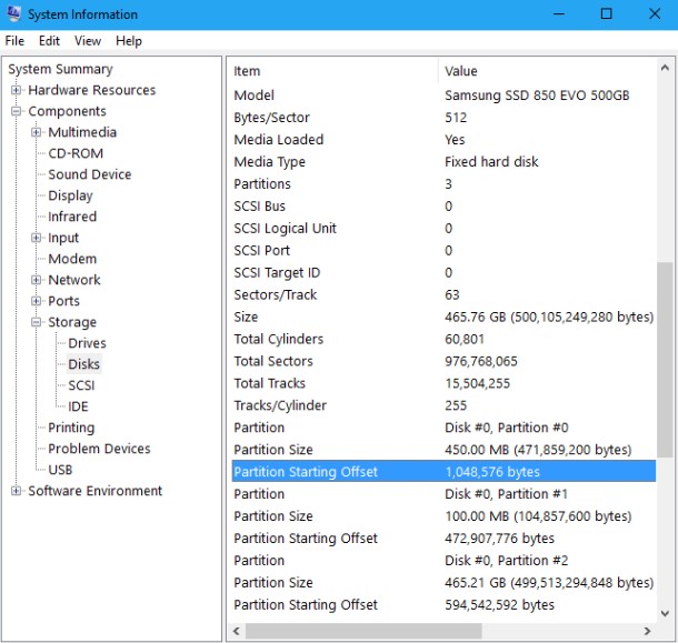 Head to Components > Storage > Disks. Scroll down in the left pane, locate your SSD, and find the “Partition Starting Offset” value below it. There will be a different partition starting offset value for each partition on the drive.
