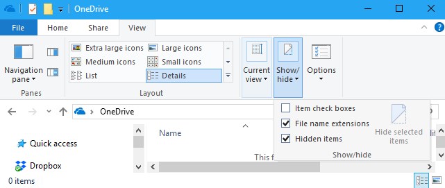 open File Explorer, click the “View” tab on the ribbon at the top of