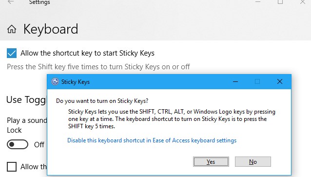 other settings) by default. So, for example, if you turn the Sticky Keys