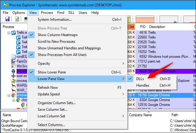 Download and run Process Explorer if you’d like to do this. Click View > Lower Pane View > DLLs or press Ctrl+D.